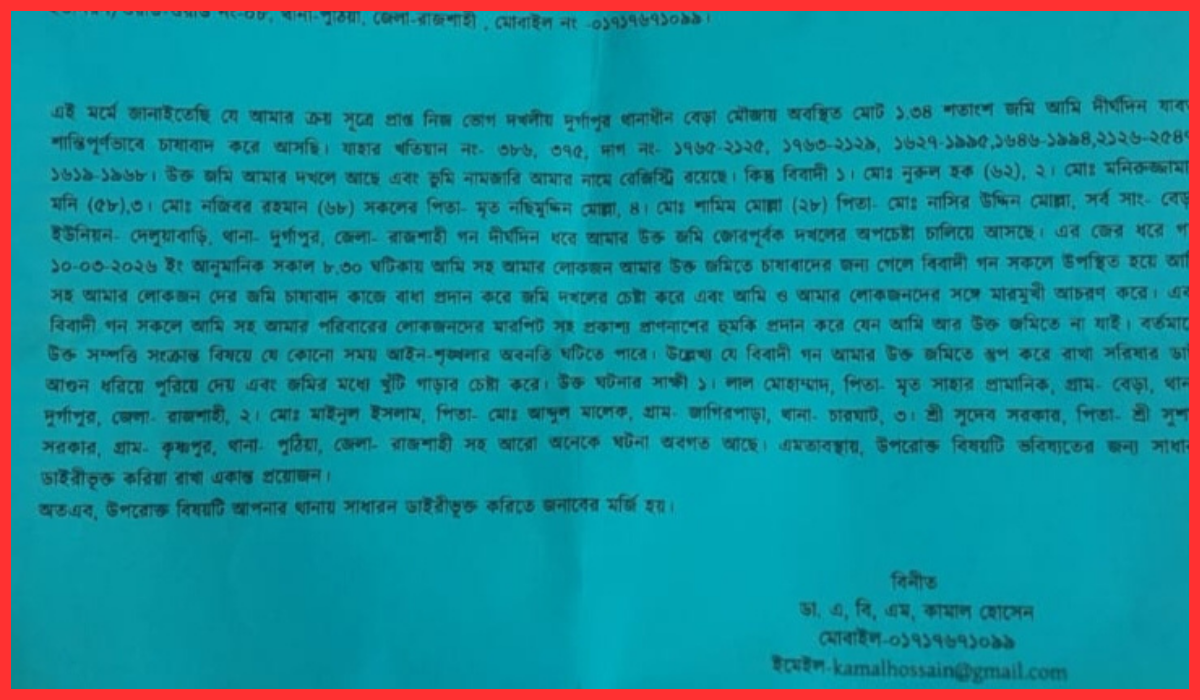 তিনি আরও অভিযোগ করেন, গত মঙ্গলবার সকালে অভিযুক্তরা তাদের লোকজন নিয়ে তার ভোগদখলীয় জমি দখলের চেষ্টা করেন এবং তাকে বিভিন্নভাবে হুমকি-ধামকি দেন। দখলের চেষ্টা ব্যর্থ হলে জমিতে রাখা সরিষার খড়ের স্তুপে আগুন দেন এবং বাঁশের খুঁটি গেড়ে দখলের চেষ্টা করেন। একই সঙ্গে তাকে প্রাণনাশের হুমকিও দেওয়া হয়েছে বলে দাবি করেন তিনি।