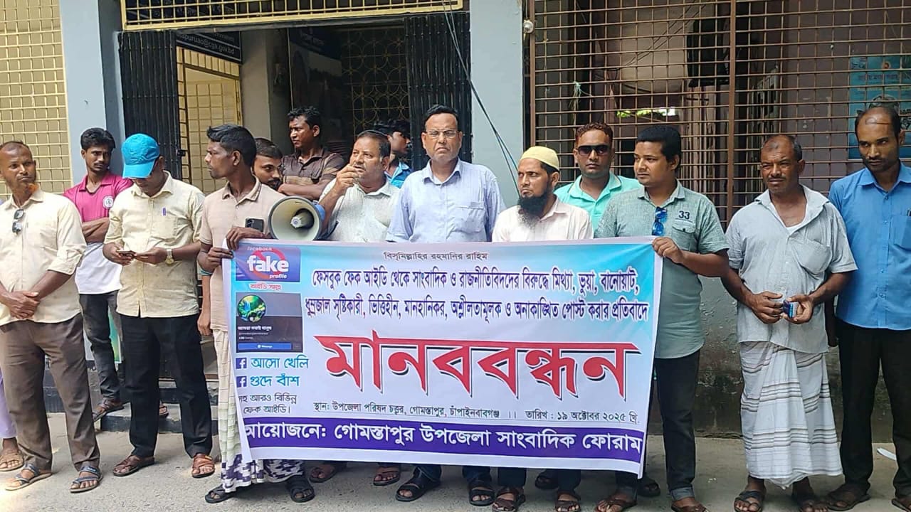 চাঁপাইনবাবগঞ্জের গোমস্তাপুরে সাংবাদিক ও স্থানীয় রাজনীতিবিদদের বিরুদ্ধে ফেসবুকের ফেক আইডি ব্যবহার করে ধারাবাহিকভাবে মিথ্যা, ভুয়া, বানোয়াট ও মানহানিকর তথ্য ছড়ানোর প্রতিবাদে মানববন্ধন অনুষ্ঠিত হয়েছে।