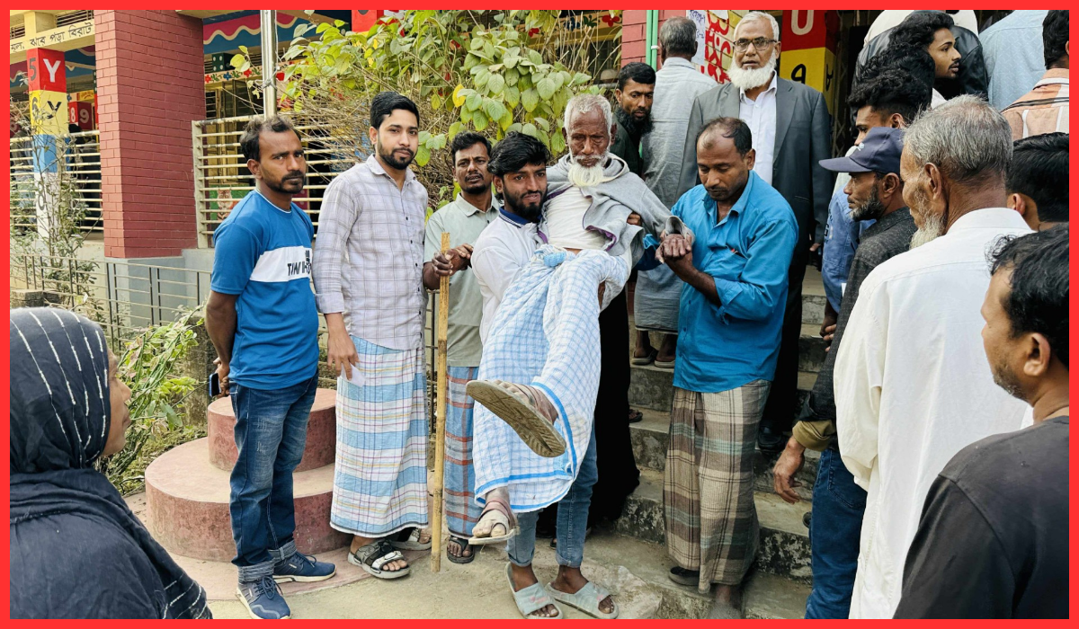 ছেলের কোলে ভর করে ভোটকেন্দ্রে এসে ভোটাধিকার প্রয়োগ করলেন ৮৫ বছর বয়সী কবির হোসেন।