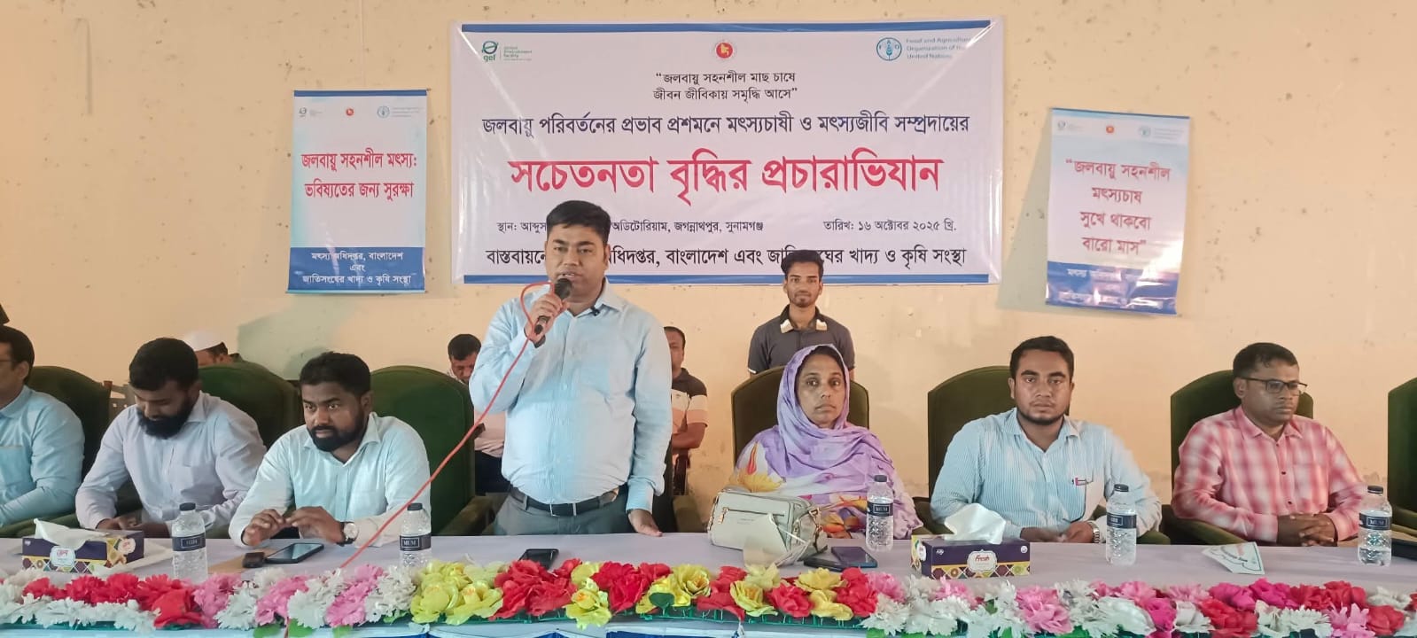 "জলবায়ু সহনশীল মাছ চাষে, জীবন জীবিকায় সমৃদ্ধি আসে’’ এই প্রতিপাদ্য বিষয় সামনে রেখে সুনামগঞ্জের জগন্নাথপুর উপজেলায় জলবায়ু পরিবর্তনের প্রভাব প্রশমনে মৎস্য চাষি ও মৎস্যজীবী সম্প্রদায়ের সচেতনতা বৃদ্ধির প্রচারাভিযান অনুষ্ঠান পালিত হয়েছে।