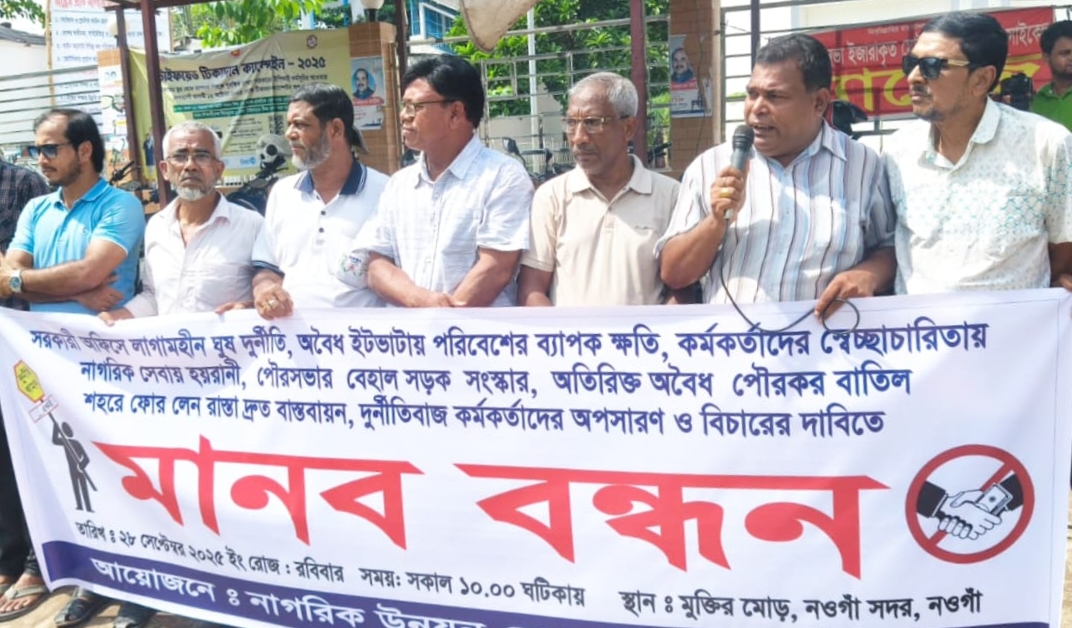 নওগাঁ জেলার বিভিন্ন সরকারি দপ্তরে লাগামহীন ঘুষ, দুর্নীতি ও কর্মকর্তাদের স্বেচ্ছাচারিতার প্রতিবাদে এবং নাগরিক সেবায় হয়রানির বিরুদ্ধে মানববন্ধন অনুষ্ঠিত হয়েছে।