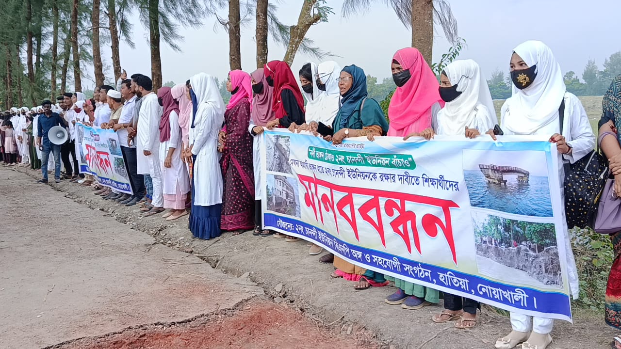 শুক্রবার (১৭ অক্টোবর) সকাল ১১টায় সুবর্ণচর উপজেলার চানন্দী ইউনিয়নের দরবেশ বাজার এলাকায় এই মানববন্ধন অনুষ্ঠিত হয়। এতে হাজী মোশারফ হোসেন কলেজের শিক্ষার্থী, শিক্ষক, স্থানীয় সমাজসেবক ও সাধারণ মানুষ অংশ নেন।