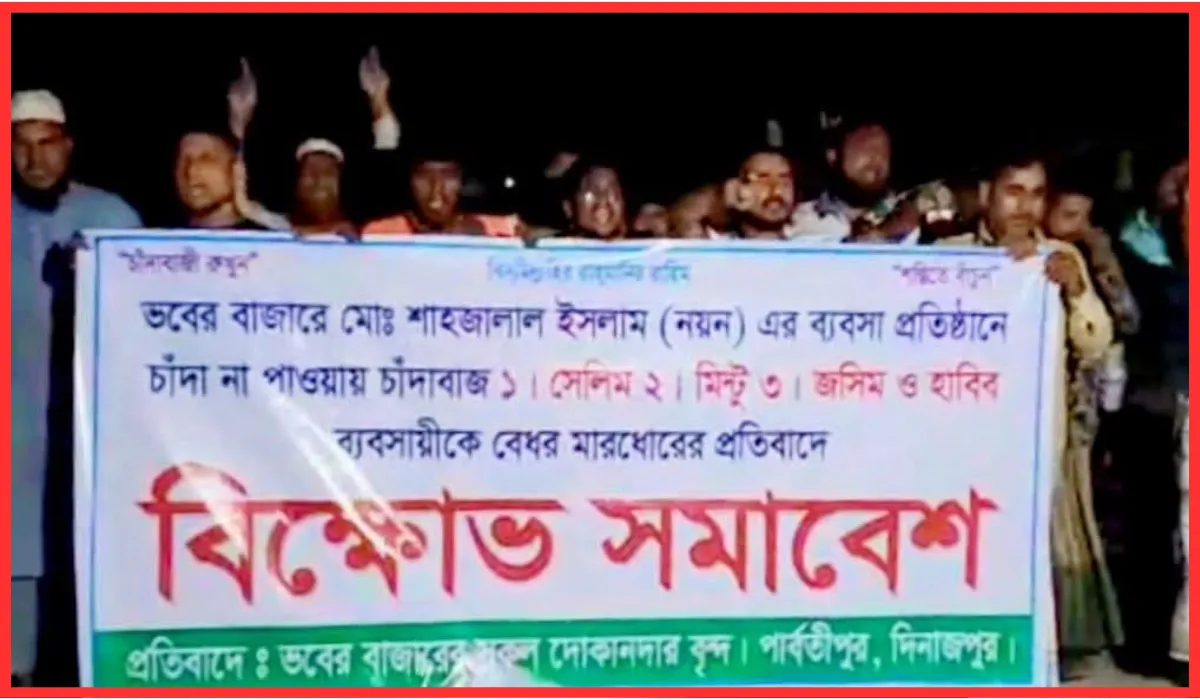 দিনাজপুরের পার্বতীপুর উপজেলার ভবের বাজারে চাঁদা না দেওয়ায় এক ব্যবসায়ীর ওপর সন্ত্রাসী হামলার প্রতিবাদে বিক্ষোভ সমাবেশ করেছে স্থানীয় ব্যবসায়ীরা। বৃহস্পতিবার (১৬ এপ্রিল) রাত ৮টার দিকে বাজার এলাকায় এ কর্মসূচি অনুষ্ঠিত হয়।