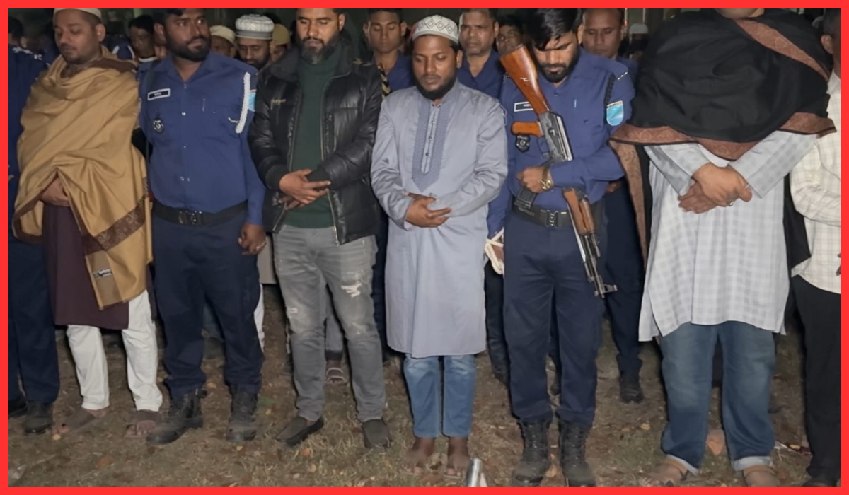রাজবাড়ীতে প্যারোলে মুক্তি পেয়ে পুলিশ পাহারায় বাবার জানাজায় অংশ নিয়েছেন রাজবাড়ী সদর উপজেলা ছাত্রদলের সাংগঠনিক সম্পাদক মো. আলাউদ্দিন পাটোয়ারী (২৮)।