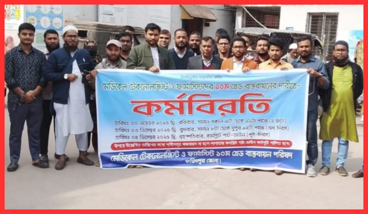 ফরিদপুরে মেডিকেল টেকনোলজিস্ট ও ফার্মাসিস্টদের ১০ম গ্রেড বাস্তবায়নের দাবিতে কর্মবিরতি