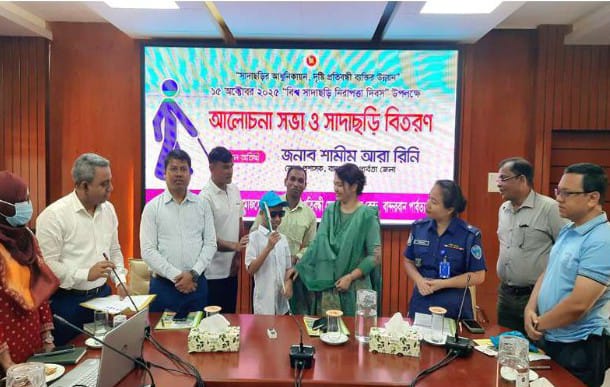 আলোচনা সভা শেষে প্রধান অতিথি বান্দরবান জেলা প্রশাসক শামীম আর রীনী ৫ জন দৃষ্টি-প্রতিবন্ধী ব্যাক্তির মাঝে স্মার্ট সাদাছড়ি বিতরণ করেন।