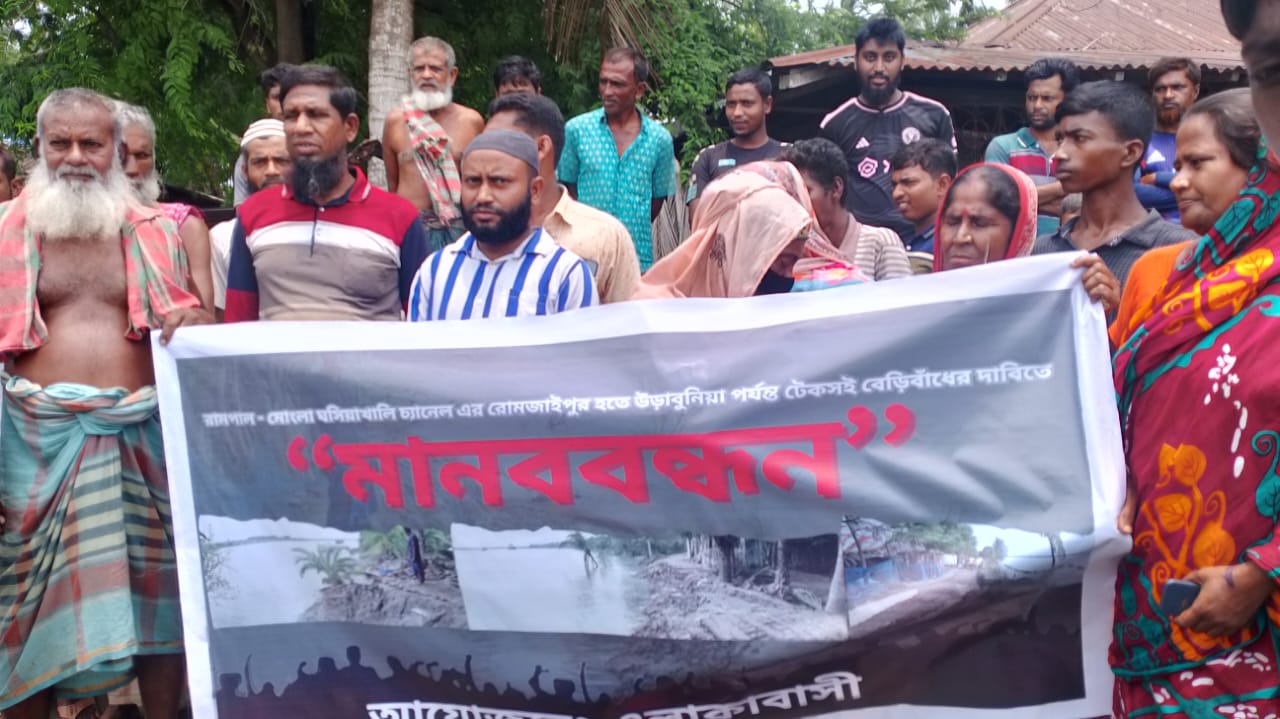"হয় আমাদের বাঁধ তৈরি করুন, না হয় আমাদের হত্যা করুন"—এমন হৃদয়বিদারক শ্লোগান সম্বলিত ব্যানার হাতে নিয়ে মানববন্ধনে অংশ নিয়েছেন বাগেরহাট জেলার রামপাল উপজেলার পেড়িখালি ইউনিয়নের রোমজাইপুর ও উড়াবুনিয়া গ্রামের শত শত এলাকাবাসী।