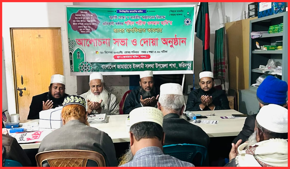 জুলাই যোদ্ধা ও ভারতীয় আগ্রাসনের বিরুদ্ধে প্রতিবাদী কন্ঠস্বর শহিদ শরিফ ওসমান হাদি'র রূহের মাগফেরাত কামনায় ফরিদপুর সালথায় জামাতে ইসলামীর আলোচনা সভা ও দোয়া মাহফিল অনুষ্ঠিত হয়েছে। উপজেলা জামায়াতে ইসলামীর আয়োজনে শনিবার (২০ ডিসেম্বর) বাদ মাগরিব উপজেলা জামায়াতের কার্যালয়ে এই দোয়া মাহফিল অনুষ্ঠিত হয়।