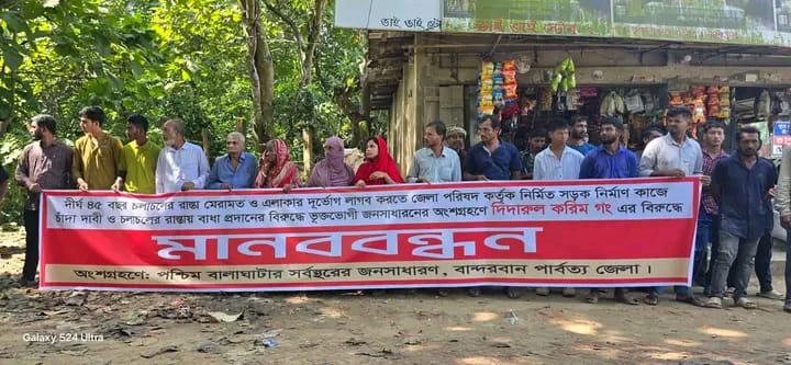 সড়ক নির্মাণ কাজে চাঁদাবাজি ও বাধা প্রদানের অভিযোগে বান্দরবানে মানববন্ধন