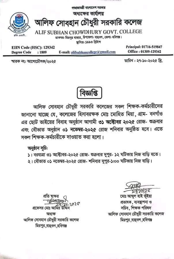 সরকারি কলেজের প্যাডে বিয়ের দাওয়াত, শিক্ষাঙ্গনে বিতর্ক
