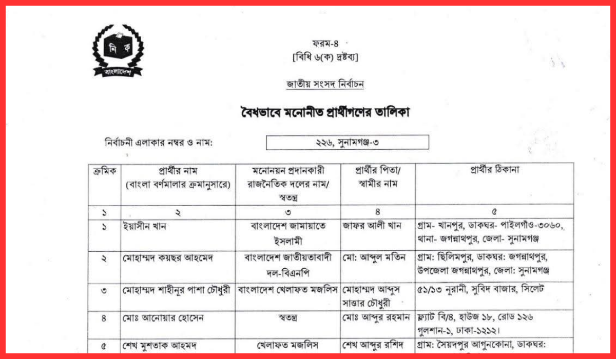 সুনামগঞ্জ জেলা প্রশাসকের সম্মেলন কক্ষে জেলা রিটার্নিং কর্মকর্তা মনোনয়নপত্র যাচাই-বাছাই শেষে এই সিদ্ধান্ত গ্রহণ করেন।