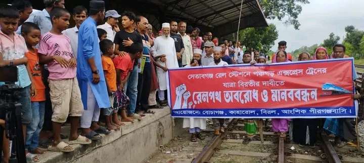 দিনাজপুর জেলার বোচাগঞ্জ উপজেলায় সেতাবগঞ্জ রেলস্টেশনে যাত্রাবিরতির দাবিতে পঞ্চগড় এক্সপ্রেস ট্রেন অবরোধ করেছেন এলাকাবাসী। শনিবার (তারিখ উল্লেখযোগ্য হলে যুক্ত হবে) তারা মানববন্ধন ও অবরোধ কর্মসূচি পালন করেন।