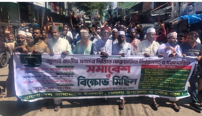 পৌর শহরের ১নং জেটি চত্বরে কেন্দ্র ঘোষিত বিক্ষোভ কর্মসূচীর অংশ হিসেবে জুলাই সনদের আইনী ভিত্তি প্রদান ও পিআর পদ্ধতিতে নির্বাচনসহ ৫ দফা দাবিতে মোংলা উপজেলা ও পৌর জামায়াত ইসলাম আয়োজিত সমাবেশ ও বিক্ষোভ মিছিল অনুষ্ঠিত হয়েছে